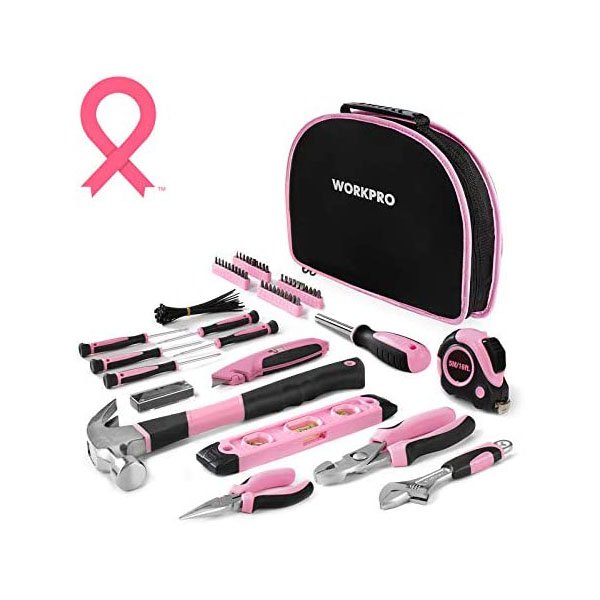 WORKPRO 103-Piece Pink Tool Kit – Ladies Hand Tool Set with Easy Carrying Round Pouch – Durable, Long Lasting Chrome Finish Tools – Perfect for DIY, Home Maintenance – Pink Ribbon