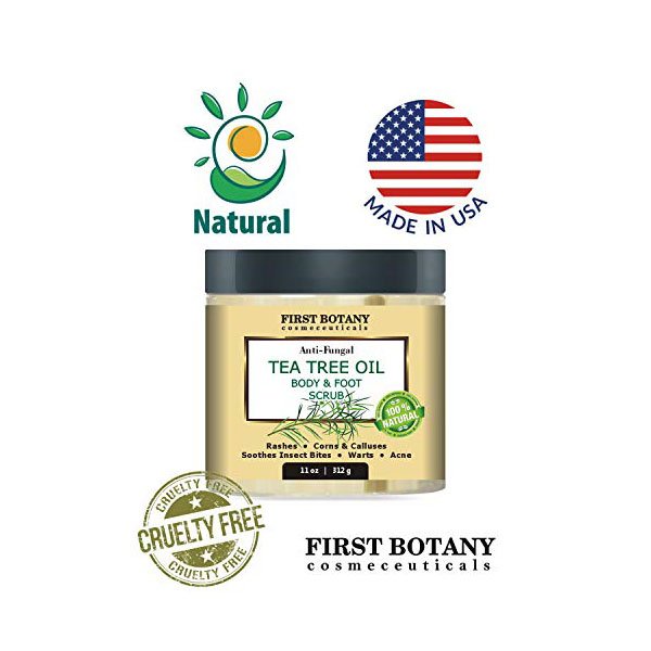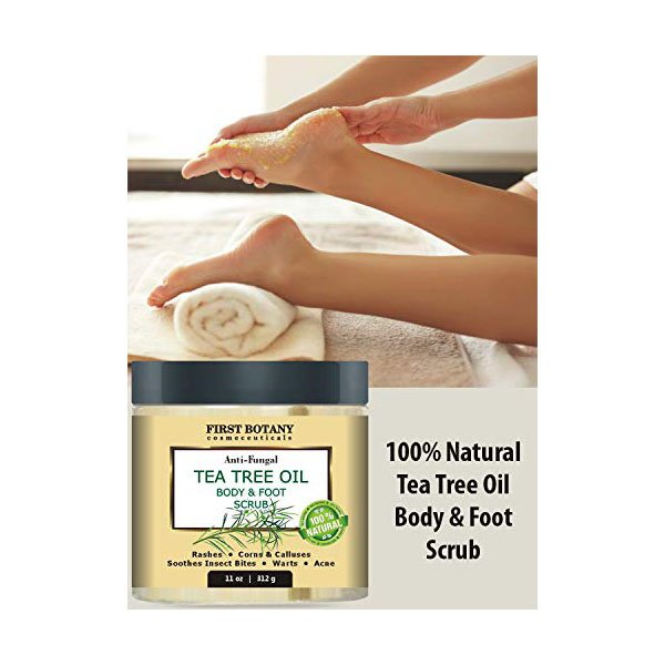NATURAL EXFOLIATOR SKINCARE: Tea tree oil body scrubber has so many anti-viral and anti-fungal benefits. We present our new foot and body scrub.. What a natural benefit for Athletes Foot treatment, Psoriasis, Ringworm, Anti Jock Itch treatment, Callus Remover, Nail Fungus & Body Odor!