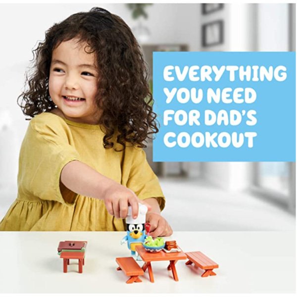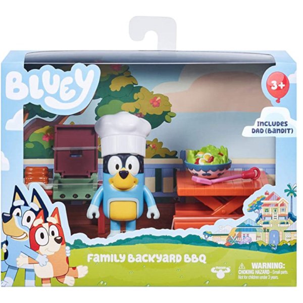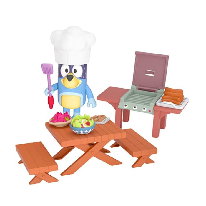 Meet Bluey! A loveable, six-year-old Blue Heeler dog, whose everyday family life becomes a playful adventure.Dad’s Backyard BBQ Playset allows you to bring the fun and imaginative play of Bluey and her family into your home! Bluey’s dad (Bandit) is a master at the BBQ and loves cooking up a tasty lunch for the family with the Backyard BBQ Playset. Bluey’s dad is dressed in his BBQ apron and chef hat and is an exclusive posable figure to this playset. He even holds a spatula in his hand to flip his food! There is plenty to play with in this fun playset including a BBQ grill, picnic table, 2 benches and 3 tasty looking pieces of food!.Children will love to recreate some of the most memorable moments from the show with these adorable toys!