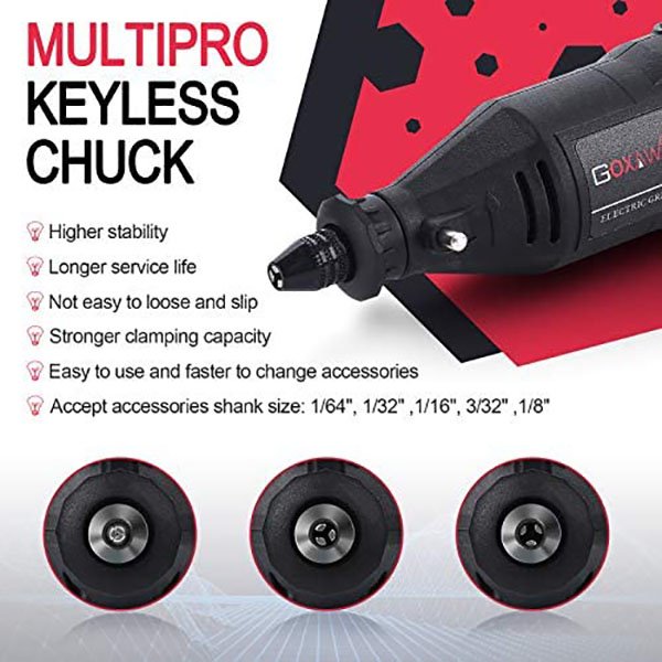 This 3 Jaw Keyless Drill Chuck allows you to quickly and easily change accessories on GOXAWEE Rotary tools without using collets & Accepts accessories from 1/64” to 1/8” shank.