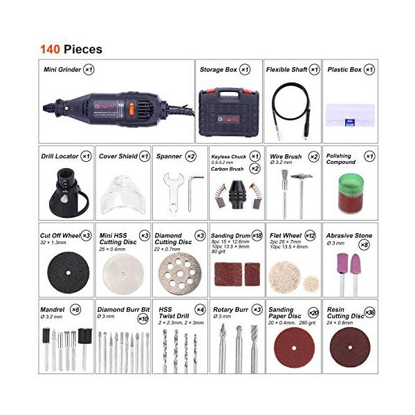 ★ 140pcs Attachment & Accessory – Flexible Shaft holds like a pen for your precise projects. Cover Shield provide better protection for cutting and grinding. Drill Locator helps for precision work on wood. Diamond Cutting Wheel is the best tips for glass, ceramic, floor tile etc. Versatile accessories include a pair of extra carbon brush, rescue you from searching new set and saving money.