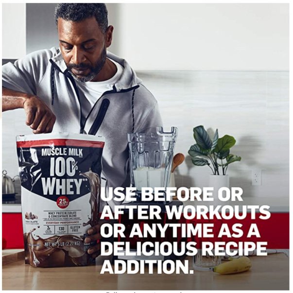 MUSCLE MILK 100% WHEY protein powder dissolves easily in water, making it convenient to use before and/or after workouts, or anytime you are looking for a protein boost. Just mix 1 scoop (33g vanilla or 34g chocolate) in 6-8 fluid ounces of water. You can also add 100% WHEY to cereal, yogurt, oatmeal, pancakes, waffles and other foods when you are looking for a protein boost.
