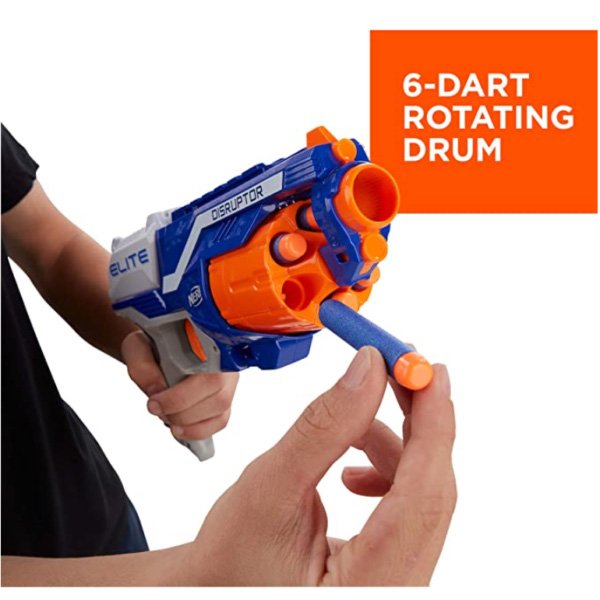 Take command of the field and unleash 6 Nerf Elite darts up to 90 feet (27 meters) with the Nerf N-Strike Elite Disrupter blaster that features a 6-dart rotating drum and slam-fire action to keep Nerf battlers in the middle of the action!