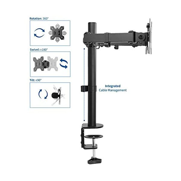 Articulation & Height Adjustment – Adjustable arm offers +90° to -90° tilt, 180° swivel, 360° rotation, and height adjustment along the center pole. Monitors can be placed in portrait or landscape orientation.
