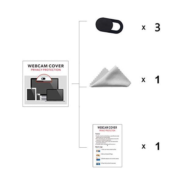 The package includes three webcam covers slides, one instruction manual and one cleaning cloth